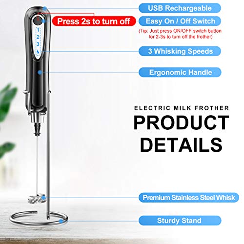 3 Whisking Speeds: Our electric milk frother mixer allow you to choose the different whisking speeds according to your need. In any gears, just press ON/OFF switch button for 2-3s to turn off the frother. The higher speed you choose, the less time you will spend, and the more exquisite foam you will create.
